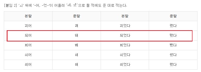 어간 모음 ‘ㅚ’ 뒤에 ‘-어’가 결합하여 ‘ㅙ’로 줄어드는 경우, ‘ㅙ’로 적는다. 예를 들어 ‘되다’와 ‘뵈다’는 다음과 같이 쓰인다.