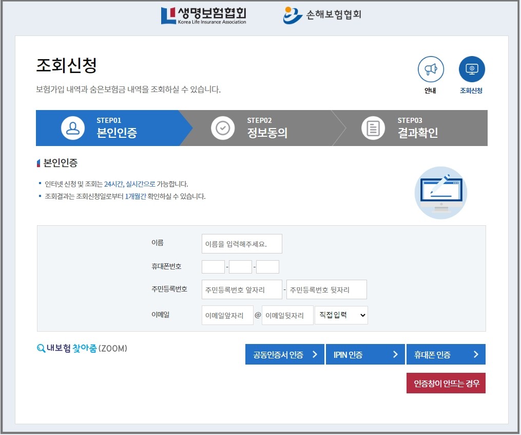 ▶ 숨은 보험금 조회하기 클릭! → 보인인증 → 정보동의 → 결과 확인