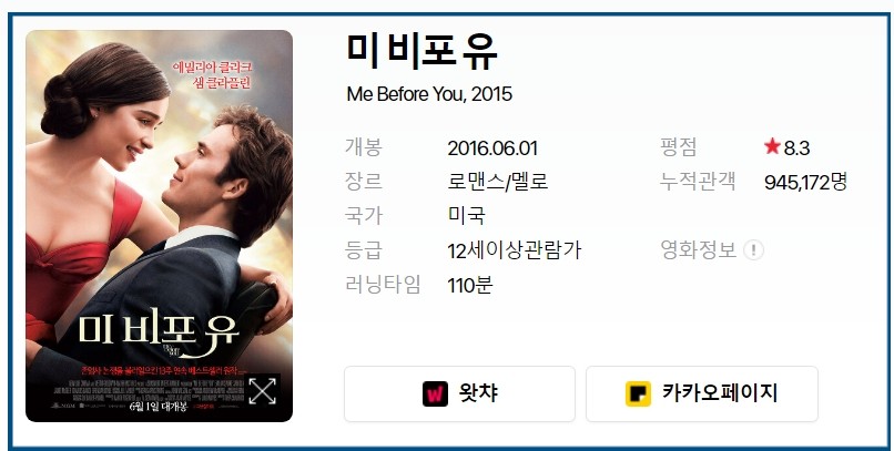 영화는 이런 무거운 주제에 윌과 클락의 감정선을 따라 잔잔하게 접근한다. 압축된 구성 때문인지 원작에 비해 몰입감이 덜 하지만, 귀엽고 사랑스러운 에밀리아 클라크의 모습과 까칠한 태도 속에 애잔한 눈빛을 담은 샘 클래플린이 로맨스 감성을 한층 더 자극한다.