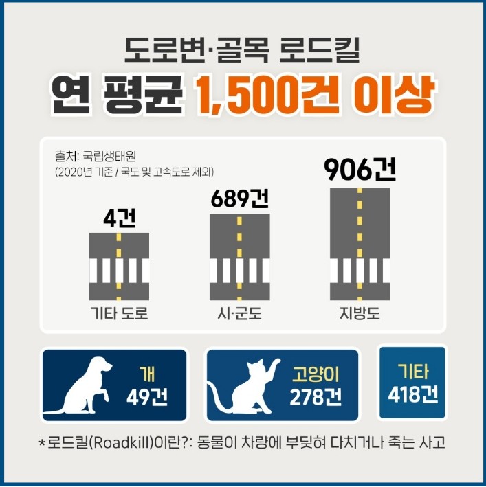 국립생태원에 따르면 2020년 기준 도로변·골목 로드킬이 연평균 1,500건 이상이다.