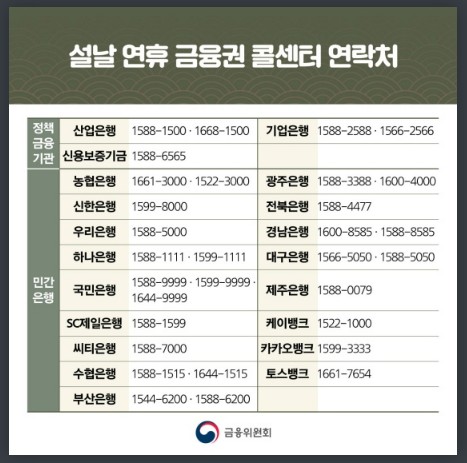| 설날 연휴 금융권 콜센터 연락처 |