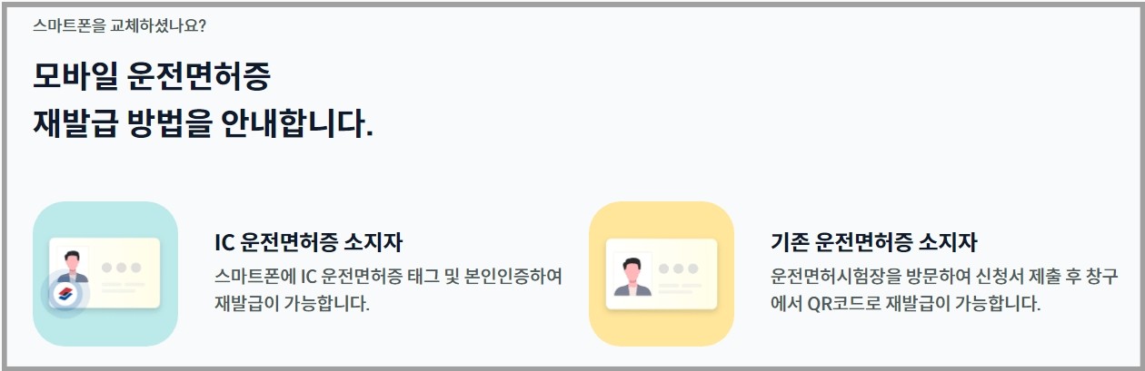 A. 스마트폰을 바꾸면 모바일 운전면허증을 재발급받아야 한다. 모바일 운전면허증의 유효기간은 3년으로 3년이 경과하면 다시 발급받아야 한다. IC 운전면허증이 있으면 기관 방문 없이 스마트폰에서 재발급받을 수 있다.