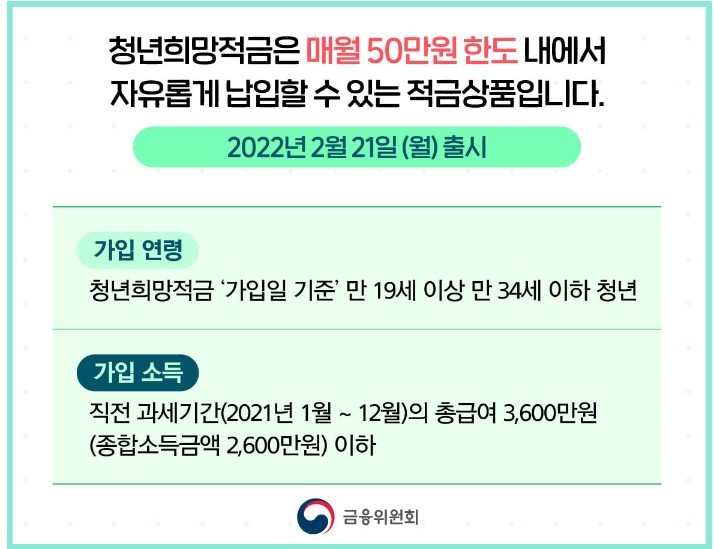 만 19세 이상에서 만 34세 이하 청년(병역이행기간(최대 6년) 제외) 중 총급여 3,600만 원, 종합소득과세 2,600만 원, 직전 3개 과세기간 중 1회 이상 금융소득종합과세 대상에 해당하지 않는 내국인 - 적금방식 월 최대 50만 원 이하 자유적립식