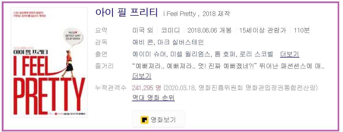 실제 모습은 바뀌지 않았다. 그러나 영화는 스스로 자신감을 갖게 됐을 때 어떻게 삶이 바뀔 수 있는 지를 보여준다. 영화 끝까지 본인에게 어떤 외모로 비춰지는지는 보여주지 않는다. 그것은 규격화된 미의 기준은 없으며 그러한 기준은 사회가 우리에게 심어 놓은 기준일 수 있다는 메시지가 아닐까 싶다. 민망한 지점이 있기는 하지만, 무겁지 않고 유쾌하게 영화를 즐길 수 있다.