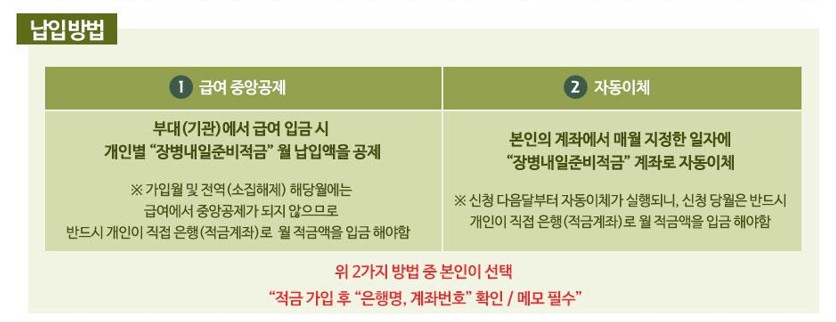 ※ 전역월에는 장병내일준비적금이 급여에서 중앙공제가 되지 않으므로, 반드시 전역일 전까지 개인이 직접 계좌에 적금액 납입