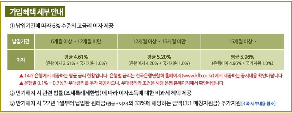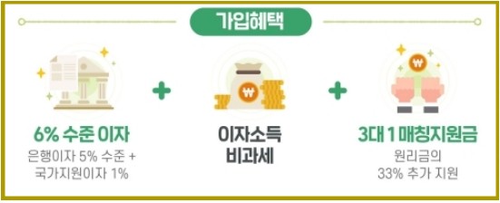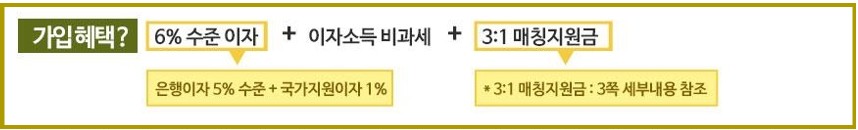 6% 수준 이자(은행이자 5% 수준 + 국가지원이자 1%) + 이자소득 비과세 + 3:1 매칭지원금(원리금의 33% 추가 지원)