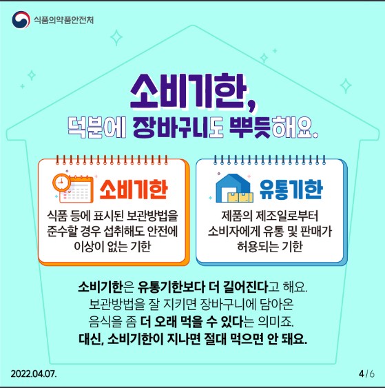 소비기한은 유통기한보다 더 길어진다. 보관방법을 잘 지키면 장바구니에 담아온 음식을 좀 더 오래 먹을 수 있다는 의미. 대신, 소비기한이 지나면 절대 먹으면 안 된다.