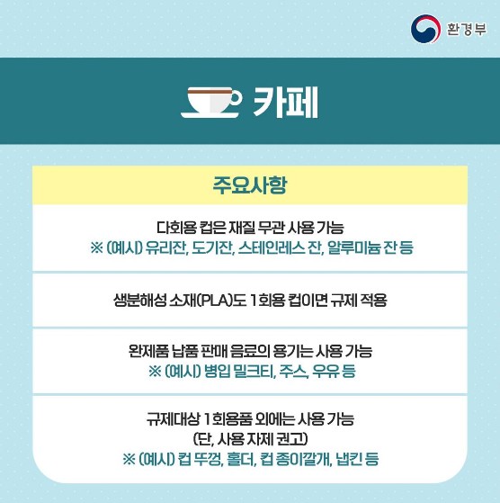 *예시 : 병입 밀크티, 주스, 우유 등 - 규제 대상 1회 용품 외에는 사용 가능 (단, 사용 자제 권고)