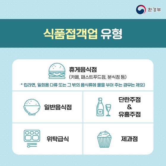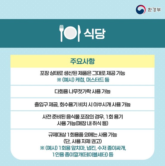 - 사전 준비된 음식물 포장의 경우, 1회 용기 사용 가능(매장 내 취식 등)