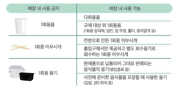 - 규제 대상 1회 용품(나무젓가락 등) 사용 가능
