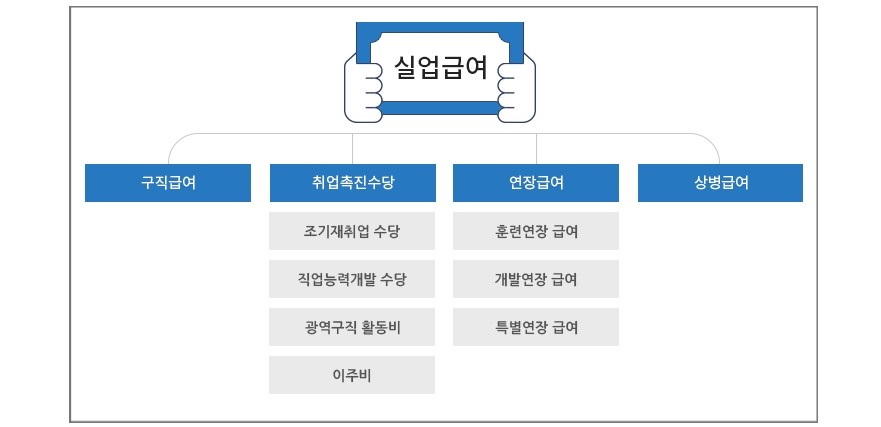 실직한 근로자의 생활안정과 재취직을 촉진하기 위하여 지급되는 급여로 구직급여와 취직촉진수당이 있으며 취직 촉진수당에는 조기재취직수당, 광역구직활동비, 직업업능력개발수당, 이주비로 구분한다.