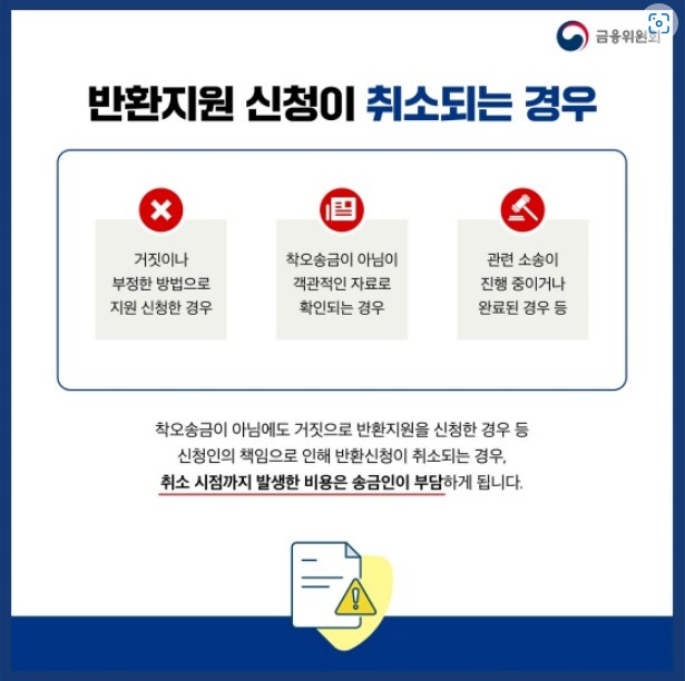 착오송금이 아님에도 거짓으로 반환 지원을 신청한 경우 등 신청인의 책임으로 인해 반환 신청이 취소되는 경우, 취소 시점까지 발생한 비용은 송금인이 부담하게 된다.