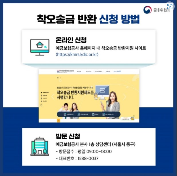 - 온라인 신청 : ‘예금보험공사 누리집 내 착오송금 반환 지원’ 바로 가기