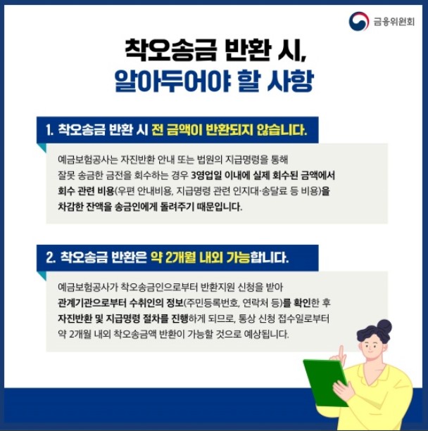 예금보험공사는 자진 반환 안내 또는 법원의 지급명령을 통해 잘못 송금한 금전을 회수하는 경우 3영업일 이내에 실제 회수된 금액에서 회수 관련 비용(우편 안내 비용, 지급명령 관련 인지대 송달료 등 비용)을 차감한 잔액을 송금인에게 돌려주기 때문이다. - 착오송금 반환은 약 2개월 내외 가능하다.