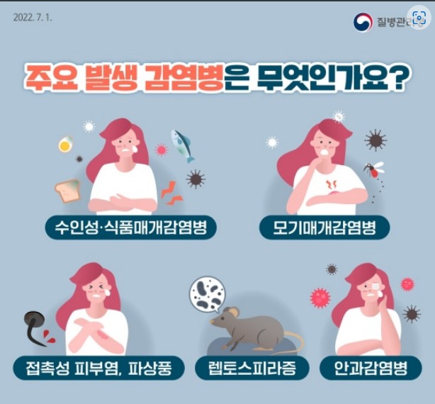 주요 발생 감염병으로는 수인성ㆍ식품매개감염병, 모기매개감염병, 접촉성 피부염ㆍ파상풍, 렙토스피라증, 안과감염병 등이 있다.