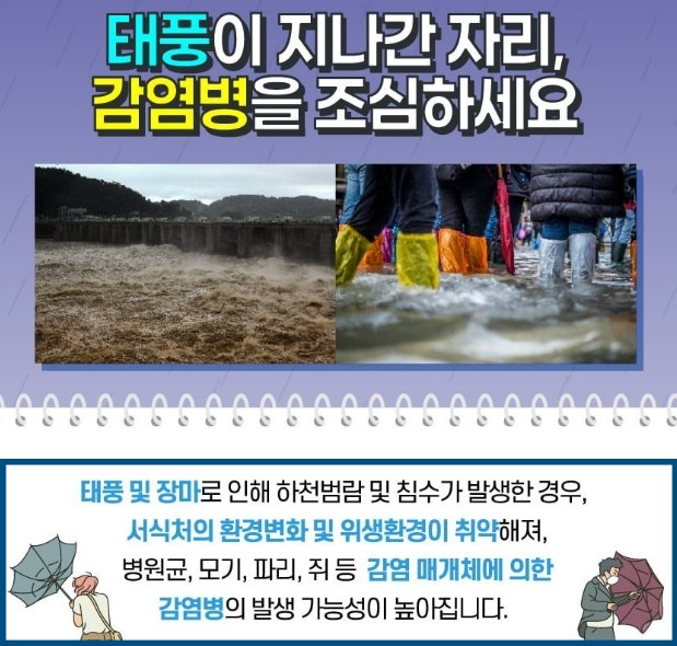 태풍 및 장마로 인해 하천범람 및 침수가 발생한 경우 서식처의 환경변화 및 위생환경이 취약해져 병원균, 모기, 파리, 쥐 등 감염 매개체에 의한 감염병이 유행할 수 있다.