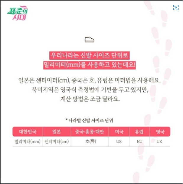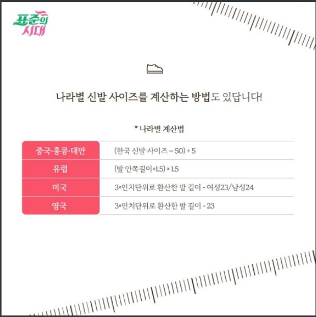 중국·홍콩·대만 : (한국 신발 사이즈-50) ÷ 5