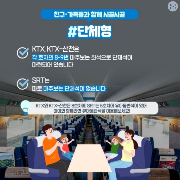 - KTX, KTX-산천은 각 호차의 8~9번 마주 보는 좌석으로 단체석이 마련되어 있습니다.