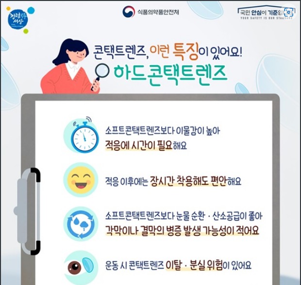 - 소프트콘택트렌즈보다 눈물 순환·산소공급이 좋아 각막이나 결막의 병증 발생 가능성이 적다.