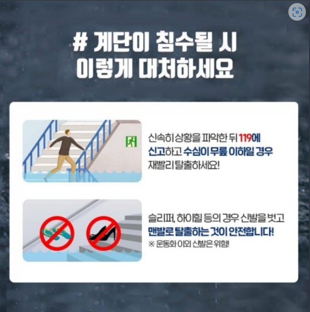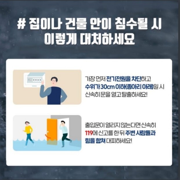 가장 먼저 전기 전원을 차단하고 수위가 30cm 종아리 아래 일시 신속히 문을 열고 탈출!