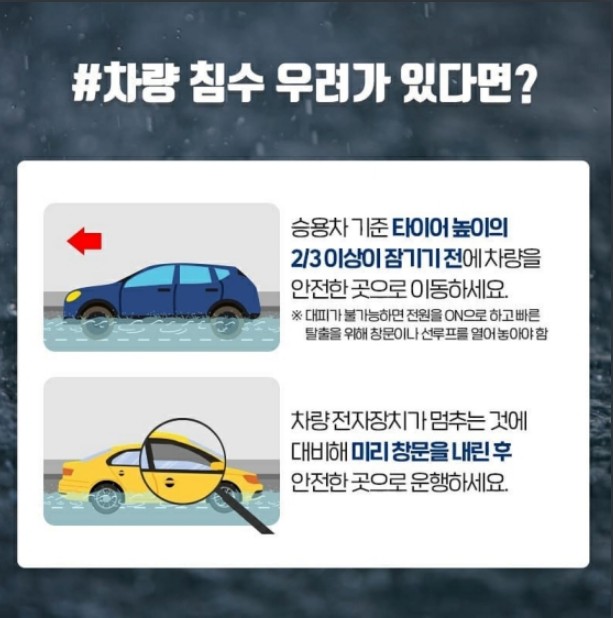 - 승용차 기준 타이어 높이의 2/3 이상이 잠기기 전에 차량을 안전한 곳으로 이동.