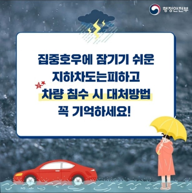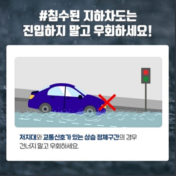 집중호우에 잠기기 쉬운 지하 차도는 피하고, 차량 침수 시 대처 방법 꼭 기억하세요!