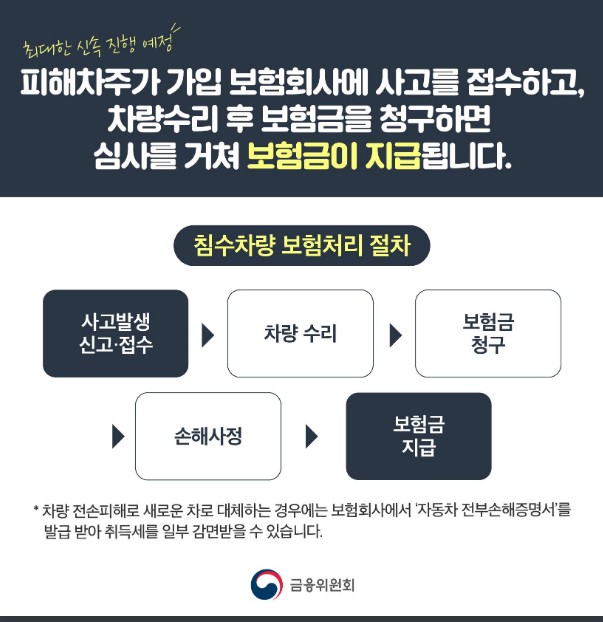 피해 차주가 가입 보험회사에 사고를 접수하고, 차량 수리 후 보험금을 청구하면 심사를 거쳐 보험금이 지급된다.