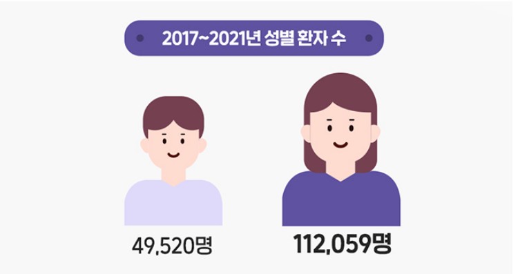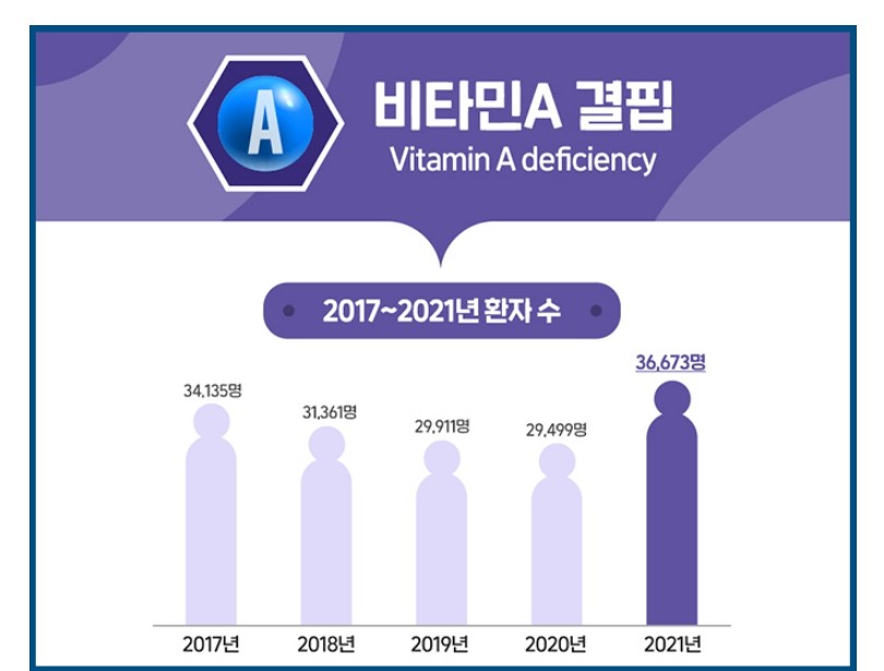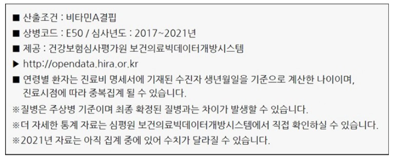 비타민A 결핍증은 2017년부터 2020년까지 지속해서 환자 수가 감소하고 있었으나, 2021년 들어 다소 증가했으며, 남성보다 여성에게 빈번히 발생하는 질환입니다. 연령별 환자 비율로는 40~49세가 17.1%로 가장 많이 발생하며, 50~59세가 16.5%로 집계되며 주로 중장년층에게 많이 발생하는 질환으로 집계됐습니다.