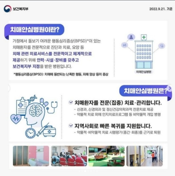 가정에서 돌보기 어려운 행동심리증상(BPSD)*이 있는 치매환자를 전문적으로 진단과 치료, 요양 등 치매 관련 의료 서비스를 전문적이고 체계적으로 제공하기 위해 인력·시설·장비를 갖추고 보건복지부 지정을 받은 병원이다.