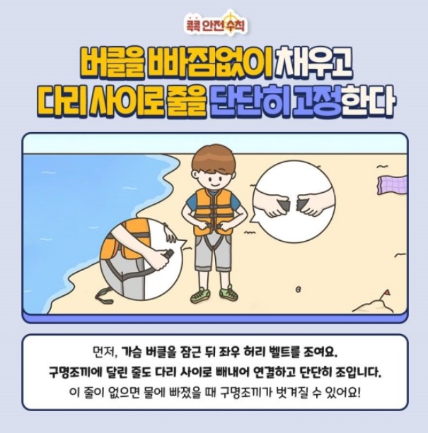 먼저, 가슴 버클을 잠근 뒤 좌우 허리 벨트를 조인다. 구명조끼에 달린 줄도 다리 사이로 빼내어 연결하고 단단히 조인다.