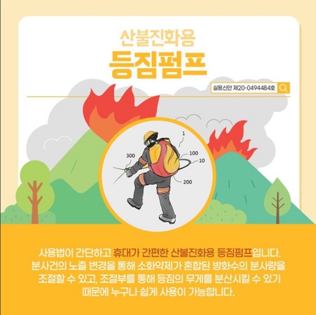 사용법이 간단하고 휴대가 간편한 산불진화용 등짐펌프이다. 분사건의 노즐 변경을 통해 소화약제가 혼합된 방화수의 분사량을 조절할 수 있고, 조절부를 통해 등짐의 무게를 분산시킬 수 있기 때문에 누구나 쉽게 사용이 가능하다.