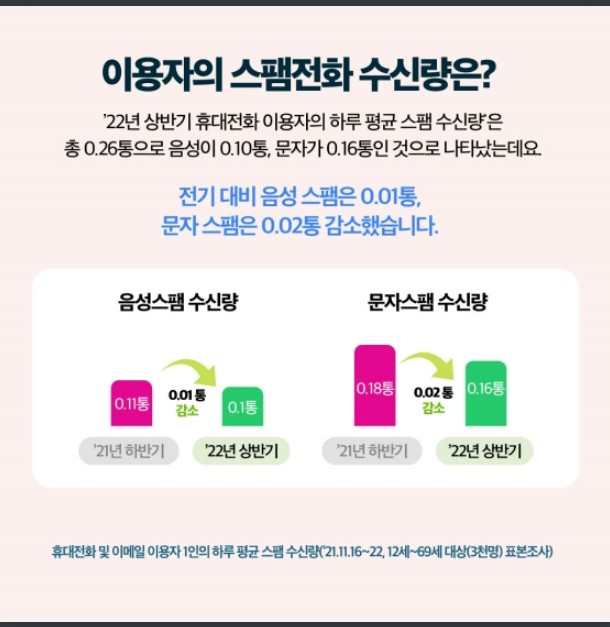 - 전기 대비 음성 스팸은 0.01통, 문자 스팸은 0.02통 감소했다.