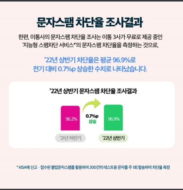 - 한편, 이통사의 문자 스팸 차단율 조사는 이통 3사가 무료로 제공 중인 ‘지능형 스팸 차단 서비스*’의 문자 스팸 차단율을 측정하는 것으로, ’22년 상반기 차단율은 평균 96.9%로 전기 대비 0.7%p 상승한 수치로 나타났다.