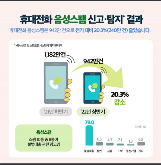 - 휴대전화 음성 스팸은 942만 건으로 전기 대비 2033%(240만 건) 줄었다.