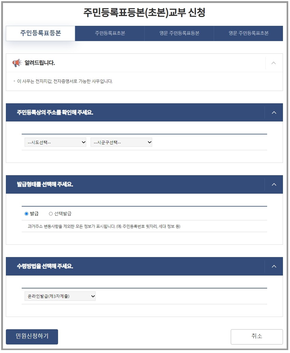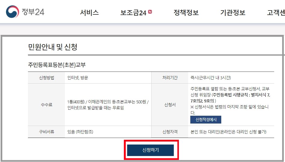 ▶ 주민등록등복(초본) 클릭 → 신청하기(회원 / 비회원 신청하기) → 신청정보 입력