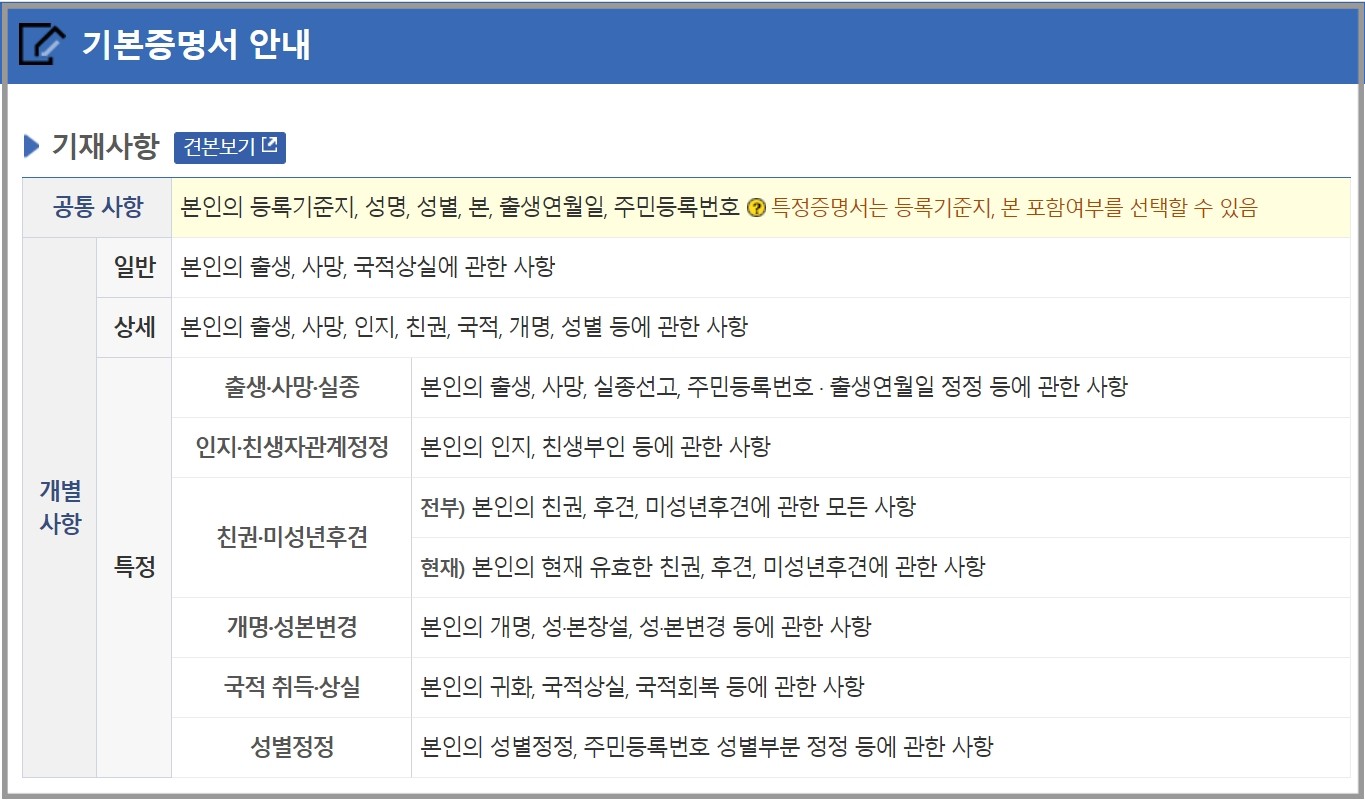 가족관계증명서 본인과 부모, 배우자, 자녀에 관한 사항이 기재되는 증명서입니다. 자세히 보기 기본증명서 본인의 출생, 사망, 국적 등에 관한 사항이 기재되는 증명서입니다. 자세히 보기 혼