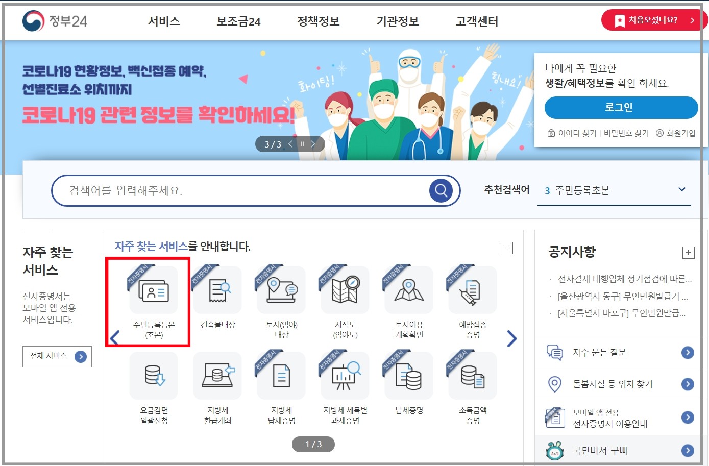 ■ 주민등록등본(초본) 발급 (인터넷) : 정부24 https://www.gov.kr/