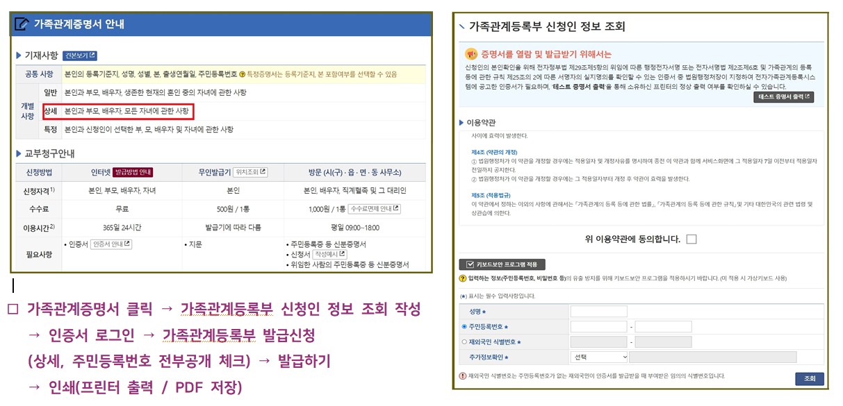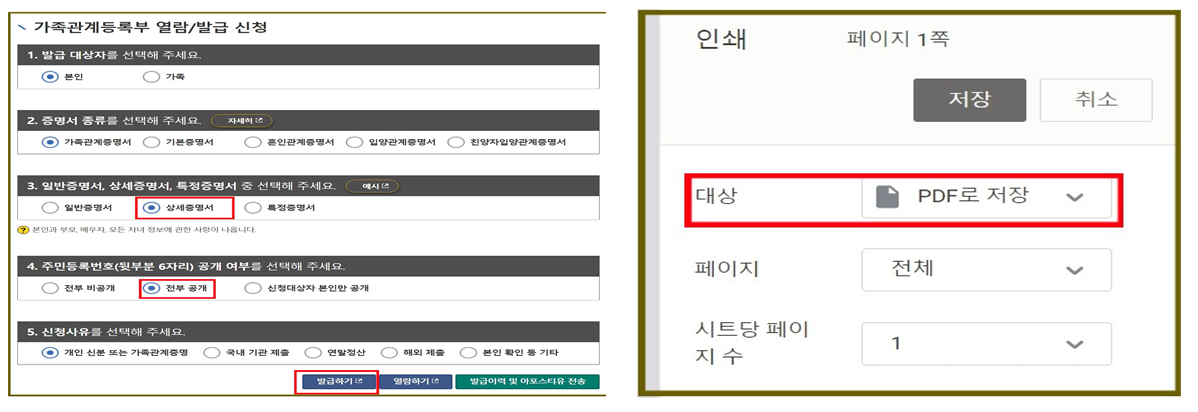▶ 기본 증명서 발급 (가족관계증명서와 동일한 순서로 발급 신청)