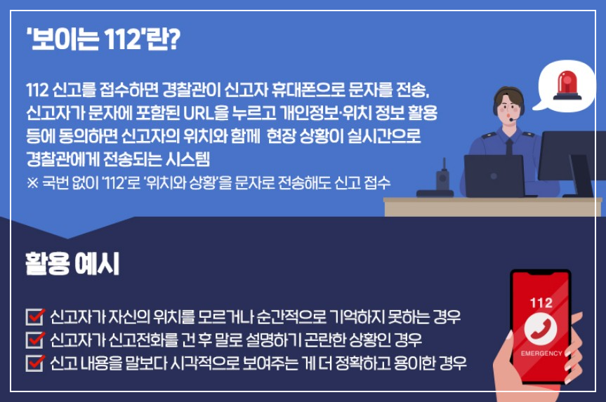 112 신고를 접수하면 경찰관이 신고자 휴대폰으로 문자를 전송, 신고자가 문자에 포함된 URL을 누르고 개인정보·위치 정보 활용 등에 동의하면 신고자의 위치와 함께 현장 상황이 실시간으로 경찰관에게 전송되는 시스템