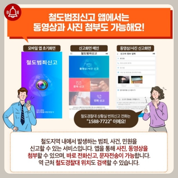 철도지역 내에서 발생하는 범죄, 사건, 민원을 신고할 수 있는 서비스이다.