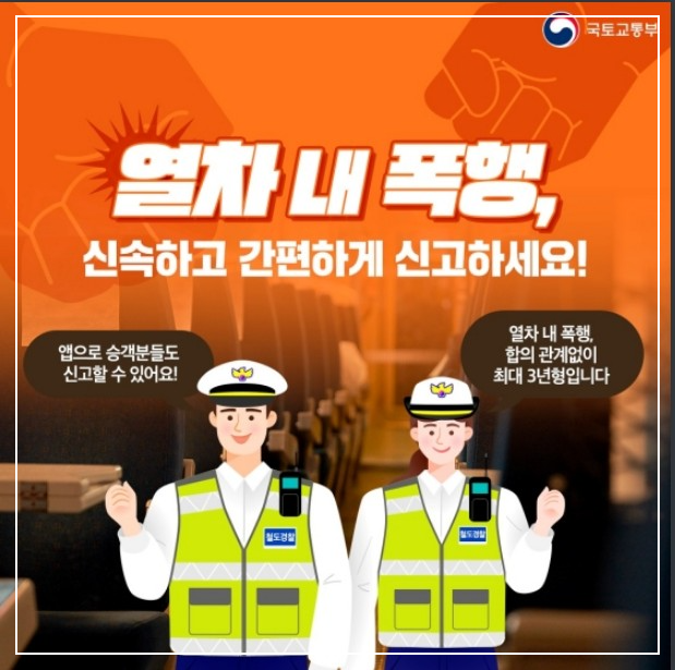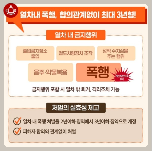 ∨ 열차 내 폭행 처벌을 강화하기 위해 가해자와 피해자가 합의 관계없이 최대 3년형으로 철도안전법이 개선되었다.