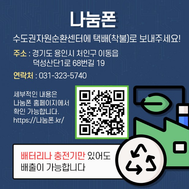 폐휴대폰 배출 방법은 이용이 용이한 택배사를 통해 착불로 수도권자원순환센터 폐휴대폰 담당자 앞으로 보내면 된다.