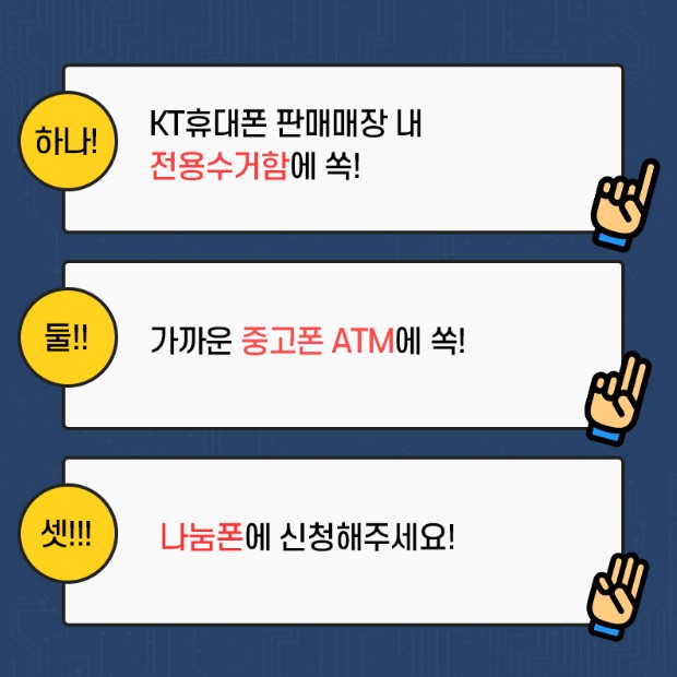 1. KT 휴대폰 판매매장 내 전용수거함에 넣기!