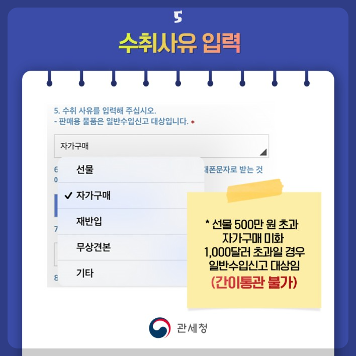선물은 500만 원 초과, 자기구매는 미화 1,000달러 초과일 경우 일반수입신고 대상임(간이통관 불가)