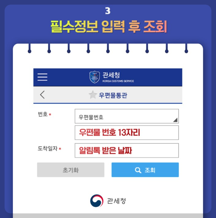 우편물번호 13자리 , 도착일자(알림톡 받은 날짜)