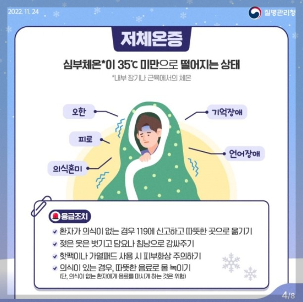 - 의식이 있는 경우, 따뜻한 음료로 몸 녹이기(단, 의식이 없는 환자에게 음료를 마시게 하는 것은 위험)