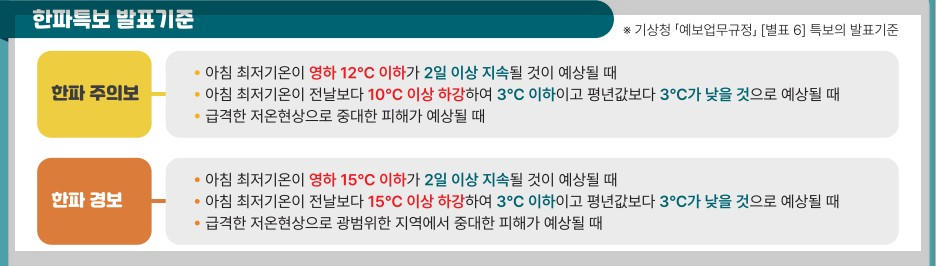 · 아침 최저기온이 영하 12℃ 이하가 2일 이상 지속될 것이 예상될 때