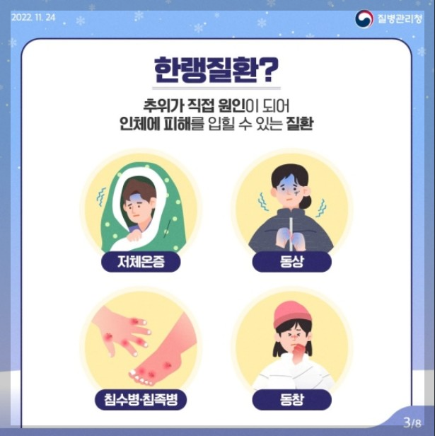 추위가 직접 원인이 되어 저체온증, 동상, 침수병·침족병, 동창 등 인체에 피해를 입힐 수 있는 질환