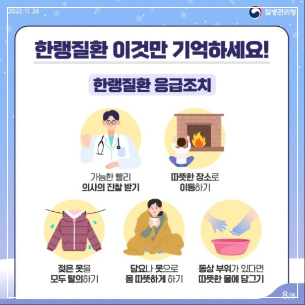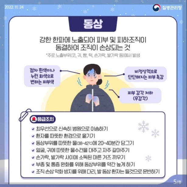 - 따뜻한 옷 입기(장갑, 목도리, 모자, 마스크 착용)
