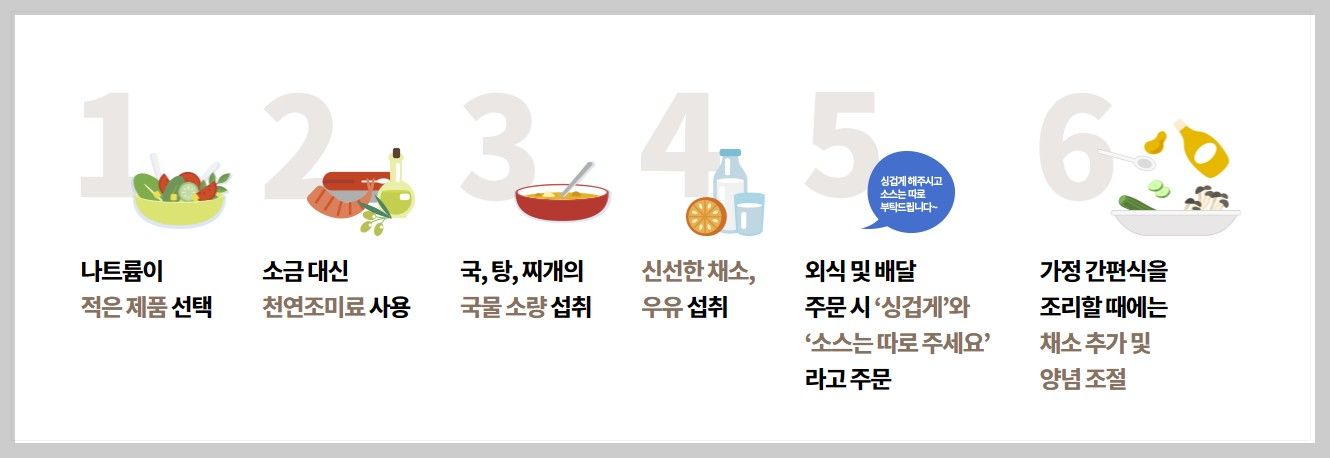 - ⑤ 외식 및 배달 주문 시 ‘싱겁게‘와 ‘소스는 따로 주세요’라고 주문